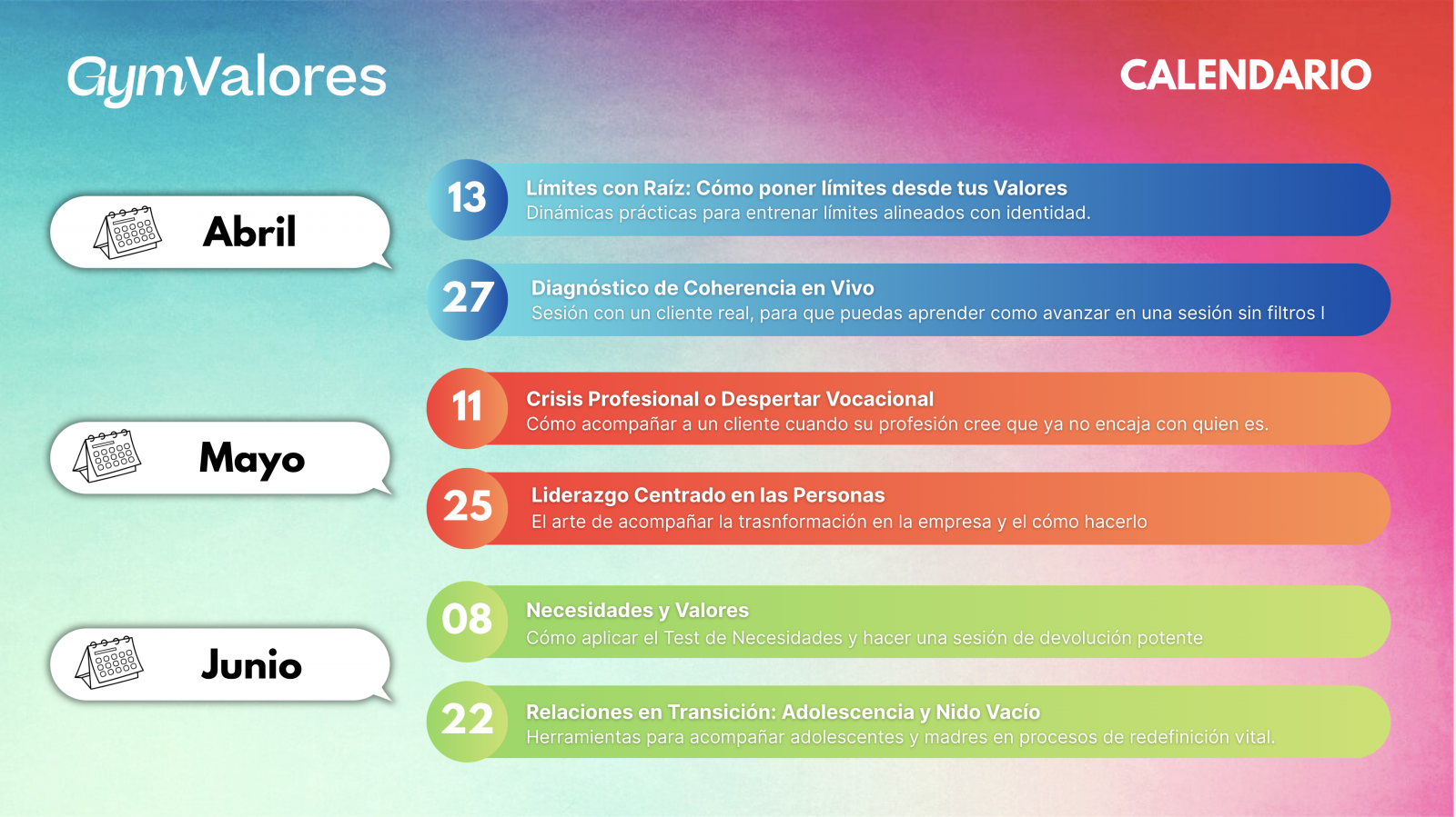 Hemos detectado que la manera de integrar los aprendizajes y ganar seguridad es ponernos en acción, a veces cuesta un poco más arrancar, pero en el Gym de valores, eso lo vamos a poner muy fácil, va a haber un espacio de prácticas mensuales, para:
